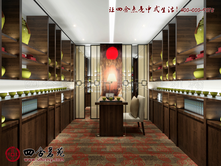 現(xiàn)代私人別墅設(shè)計品茶室,以方正的空間中融入具有時代氣息,同時又蘊藏著濃濃中式韻味的中式線條,額厚重木紋,以及祥云地毯烘托茶香古韻中的中式藝術(shù)美感。