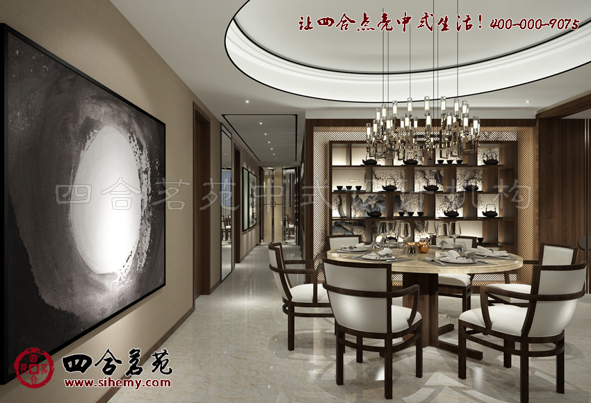 透過幾何形與西安段的組合運用,打破傳統(tǒng)與現(xiàn)代的界分,餐廳中可見別墅裝修具有現(xiàn)代感的材料,和含蓄蘊藉家具器形中蘊藏的文人情懷,在燈光渲染下毫不掩飾的展示與觀者面前,突出主人的藝術(shù)情趣。