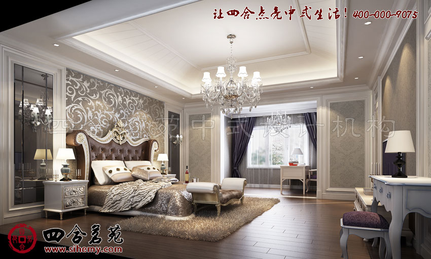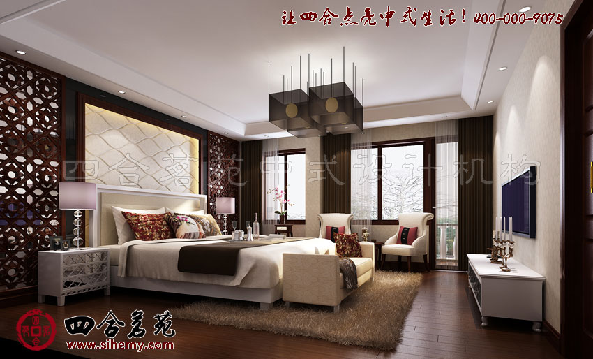 臥室采用開(kāi)場(chǎng)布局,新中式別墅設(shè)計(jì)圖中疏朗的西洋元素與宮燈配合下凸顯著新中式高端別墅軟裝設(shè)計(jì)古今融合的視覺(jué)享受溫馨而高雅。
