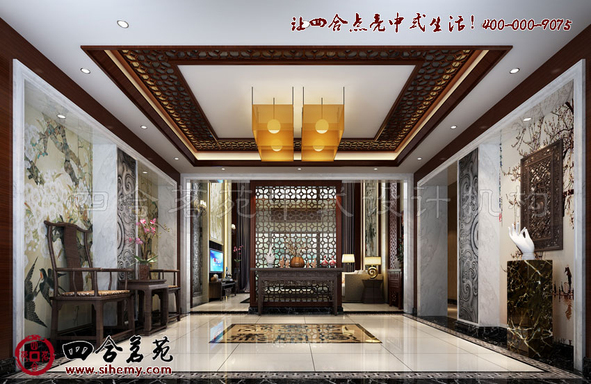 相對(duì)于主要功能區(qū)域,過(guò)渡的空間,則成為人們盡情展現(xiàn)主題的地方,在彩繪和具有中式花紋的施釉磚圍合的空間中,花格、與玄關(guān)柜再次將古典氛圍點(diǎn)染提升。