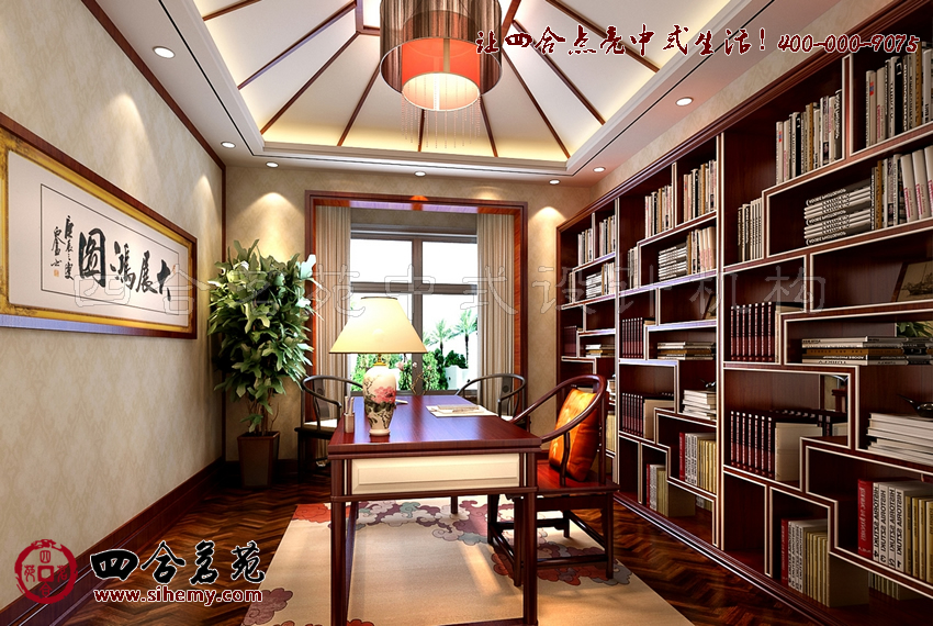 書(shū)房溫馨恬淡借以古凳圈椅多寶閣來(lái)表達(dá)中式,墻壁中若隱若現(xiàn)的線(xiàn)條和細(xì)膩肌理則凸顯時(shí)尚氣息。宮燈在紗質(zhì)材質(zhì)的圍合下,透出意思禪意,從至高的而高度統(tǒng)馭著書(shū)房中眾多經(jīng)典元素。