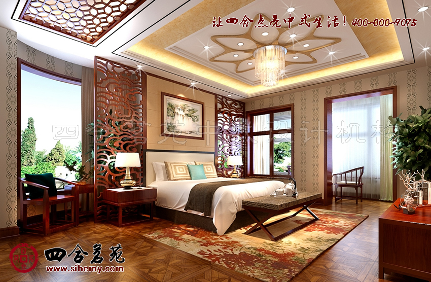 臥室采用卷云紋營(yíng)造仙風(fēng)道骨的中式氛圍,而西洋吊燈,地面鋪裝色調(diào),展現(xiàn)著西洋元素在空間中與中式元素?zé)o聲無(wú)息地融合,開(kāi)場(chǎng)玻璃窗將自然光線(xiàn)引入,紗簾將光線(xiàn)柔和的引入室內(nèi)。別墅裝修設(shè)計(jì)細(xì)節(jié)凸顯以人為本的設(shè)計(jì)理念。