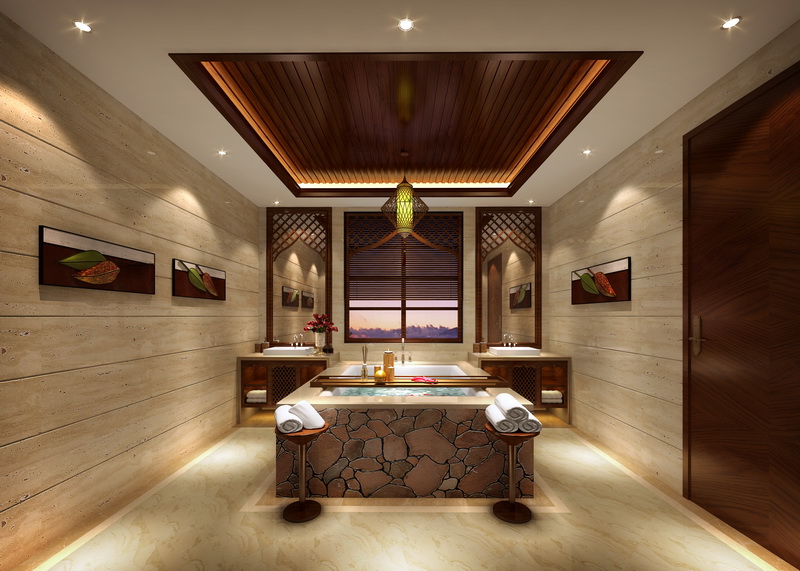 衛(wèi)浴區(qū)域別墅裝修突出古典元素的設(shè)計理念,東南亞風格在別墅設(shè)計衛(wèi)浴裝飾裝飾表現(xiàn)在幾何線條的組成中,表現(xiàn)在功能尺寸的過渡里,也表現(xiàn)在別墅軟裝設(shè)計恰如其分的布局中。