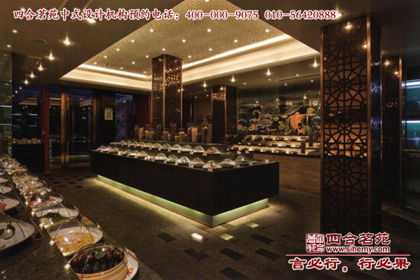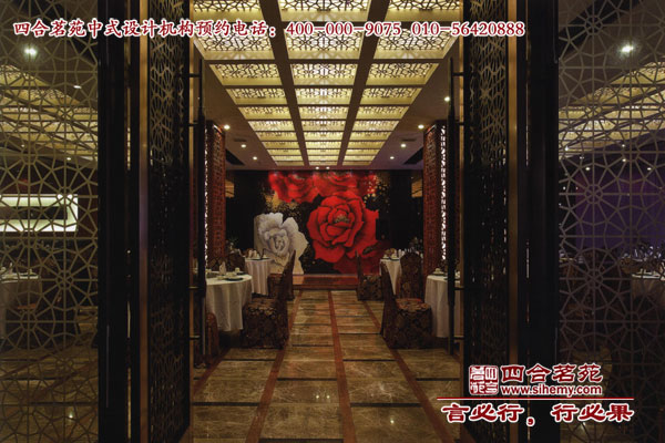 花格是這個(gè)中式空間的主角,所有情節(jié)因它展開,大廳內(nèi)白色花格在頂上一瀉至底。絳紅的顏色與正中的大幅黑底紅牡丹圖顯出喜慶與端莊。走廊地面是黑色馬賽克,用金色馬賽克以折線的方式進(jìn)行鑲嵌。衛(wèi)生間延續(xù)走廊鋪設(shè)風(fēng)格,主背景一系列的風(fēng)荷圖畫面取自黑白攝影作品,彌漫清新的江南人文情節(jié)。