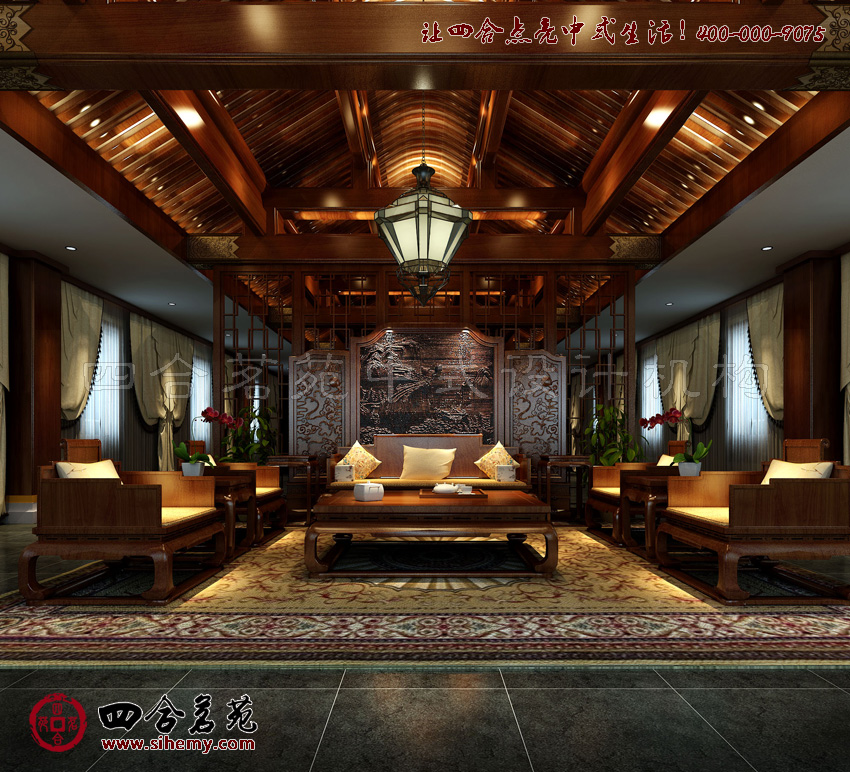 帶坡面的傳統(tǒng)木梁架構(gòu)房頂,古色古香的仿古中式吊燈,精雕細(xì)琢的隔擋。清一色的木質(zhì)家具,色調(diào)統(tǒng)一。加上幾處色彩青紅的盆景點(diǎn)綴,大氣沉穩(wěn)余又不失生動鮮活氣。