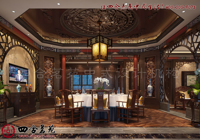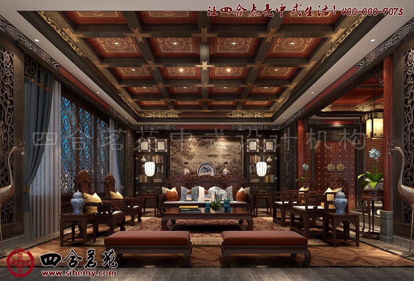 臥室中運用中式元素,點染、藻繪、升華空間,工筆畫則給板壁裝飾提供更多藝術享受,別墅裝修大空間中運用花格的中式元素,在新高端別墅設計空間總悄然圍合出舒適的現(xiàn)代感十足的古典起居空間。