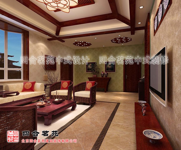 吊頂是斜面吊的 再加上木質(zhì)橫梁 把房子的高度和面積充分的體現(xiàn)出來(lái) 入戶的地方吊的是連個(gè)方孔錢(qián):象征的財(cái)路 做生意的嘛 都比較注意這個(gè)