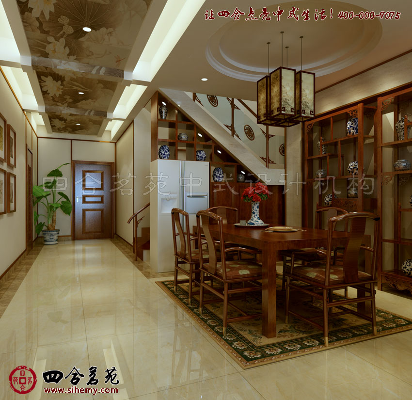 在濃濃風(fēng)華古韻中,建筑裝飾榫卯謹(jǐn)實(shí),空間布局合理巧妙,裝飾藝術(shù)充溢翰墨書香,別墅設(shè)計(jì)三位一體在空間中迂回成體。餐廳與玄關(guān)處的布局處理就全然展現(xiàn)了在多空間中對(duì)于功能與圍繞主題展開的裝飾巧妙布局?梢愿惺艿叫羌(jí)觸感與藝術(shù)品質(zhì)。