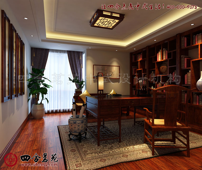 書房作為私密空間才用較為富有古典代表性的家具,而掛屏與宮燈的運(yùn)用則突出彰顯了主人非凡的品味,空間規(guī)劃的巧妙合理采用空間優(yōu)勢(shì),花架盆栽,宮燈遙相輝映展現(xiàn)出別具一格空間氛圍。