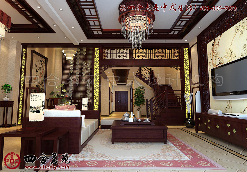 中式最新別墅設(shè)計(jì)大廳中運(yùn)用挑空的層高,營(yíng)造曠達(dá)視野,依托古典元素在其間排布,展現(xiàn)空間的合理規(guī)劃同時(shí)也流露出無(wú)限的詩(shī)情與畫意。
