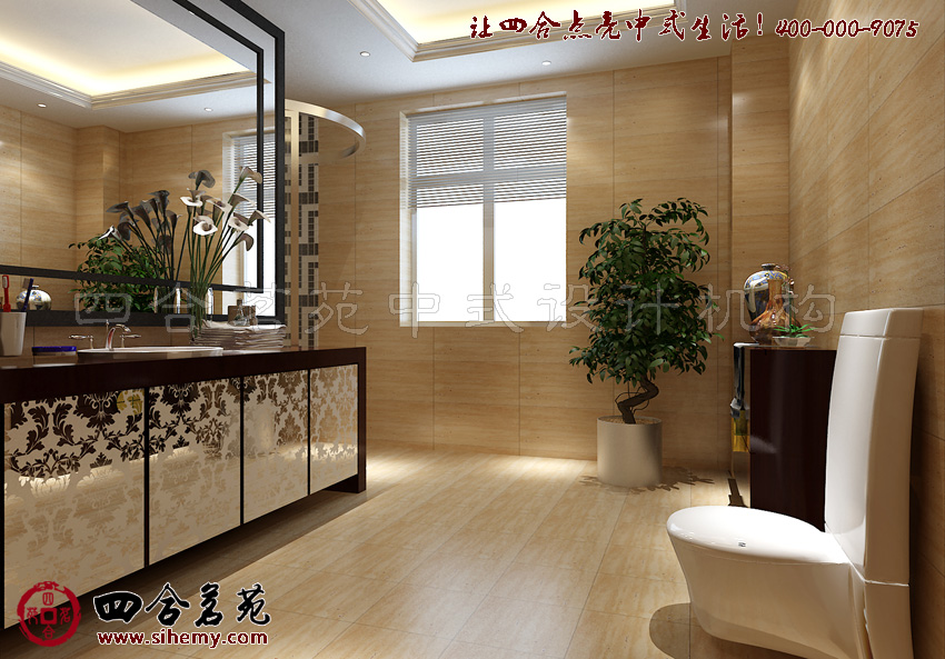 中式最新別墅設(shè)計(jì)走廊作為公共區(qū)域,巧妙仰仗壁紙與施釉磚回紋波打線將主題明確,同時(shí)也配合天花板上的卷形紋飾遙相輝映,整齊有序的變化在幾何圖形的混合運(yùn)用中展現(xiàn)出不但變化而又富有規(guī)律的設(shè)計(jì)感。