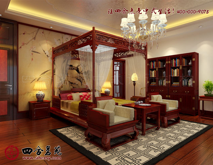 潔如珂雪的墻壁上點(diǎn)綴中式壁畫。薄紗、窗幔在光線渲染下讓設(shè)計(jì)更顯得綺麗多姿。