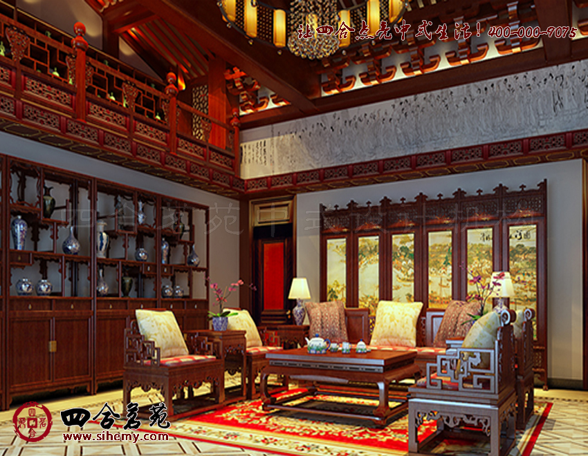 大廳中式屏風(fēng)點(diǎn)染中式氛圍,斗拱、多寶閣配飾造型古樸,在光線渲染下,顯得古色古香。
