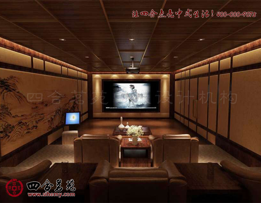 掛屏中中式題材水墨畫線條細(xì)膩,配飾軟裝古色古香,室內(nèi)裝飾色彩造型沉穩(wěn)干練。