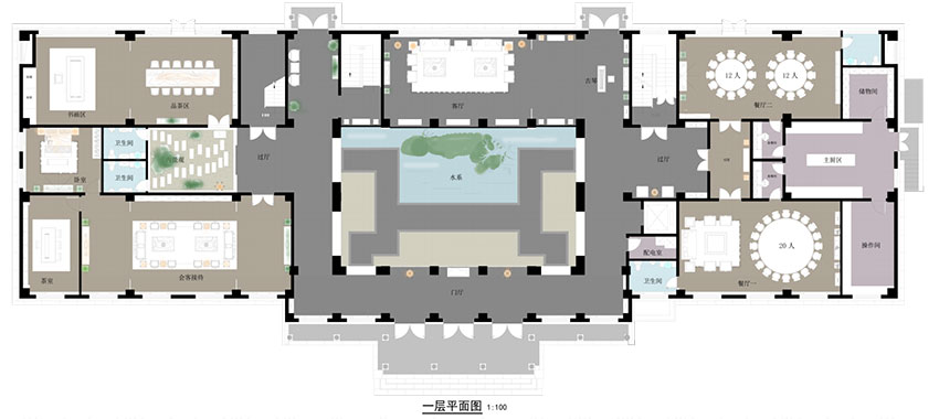 著墨濃淡相宜,并給予適當(dāng)留白,豐富空間韻味。水池搭配假山佐以背景留白賦予空靈詩意氛圍,一種自然平實(shí)的意味便被打造出來。