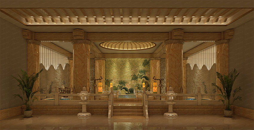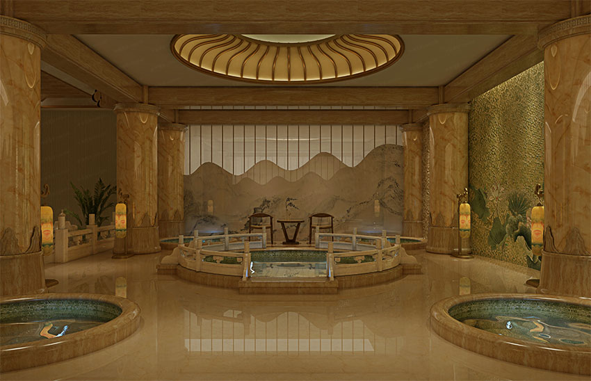 溫泉浴區(qū)大氣簡約、休閑優(yōu)雅,采用各種材料的組合與混搭,以增加空間的層次感,碰撞出不矯揉造作的設(shè)計(jì)理念。