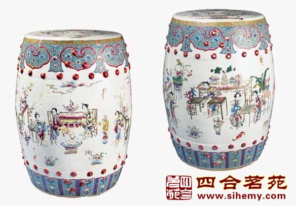 秀墩在漢代已經(jīng)出現(xiàn), 早時時多用 竹藤制成。到五代時期,出現(xiàn)了蒙有繡 套的圓墩。到了宋代,墩的使用已相當(dāng) 普遍。在宋代的坐墩卜羚們看到它往往保留著兩種物體的痕跡,即來自藤墩的圓形開光和源自鼓腔釘蒙皮革的鼓釘。在多數(shù)的明式木制坐墩上,依然以此為裝飾,就是瓷坐墩也不例外。明代坐墩傳世極少即使是清制而具有明式風(fēng)格的坐墩也為數(shù)寥寥。清代坐墩具有較復(fù)雜的裝飾和較豐富的造型,大開光、起弦紋和乳丁紋等明代簡潔做法被摒棄,墩身外墻往往有三四層 裝飾紋樣。墩體由矮碩趨向細(xì)高,坐墩高度增加。其制作材料有木、竹、藤. 瓷以及琺瑯等,墩面常常嵌有影木心,以襯托其華貴。