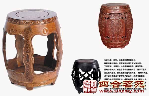 繡墩具有古雅之趣,它在造型藝術(shù)上更是千姿百態(tài),座面的式樣除圓形外,有海棠、梅花、瓜棱、橢圓形等。繡墩又有開光和不開光之區(qū)分,開光有五開光、六開光。不少繡墩上下兩頭各做出弦紋一道,雕擊鼓釘,既簡樸又美觀。墩圈雕花精致,或海棠,或竹節(jié),或藤蔓,栩栩如生,極富有藝術(shù)感染力。墩面的裝飾也很講究,除板外,還有鑲嵌彩石影木,大理石、藤等。繡墩的制作木材非常講究,常用紫檀、花梨、紅木等。另外,明清兩代瓷墩的使用極為普通,有德化、醴陵、景德鎮(zhèn)等地的產(chǎn)品。