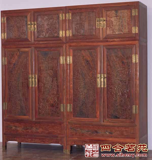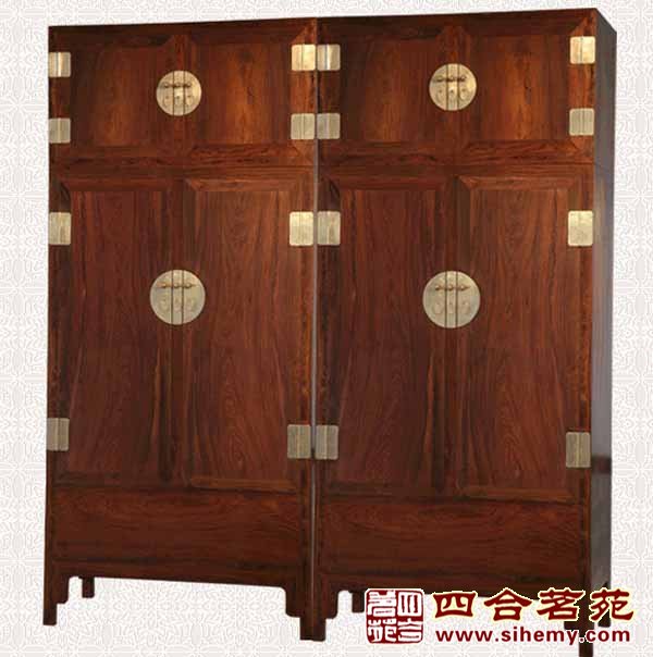 由明至清,“四件柜”一直是家具中的主要門類,這是因為它具有陳設自由度大,儲藏容量大,使用方便及裝,飾性強的特色,故而深受歡迎,尤其是得到達官顯貴們的鐘情。明代四件柜所用木材以花梨木居多,且大多光素無飾,雕刻鑲嵌各種寓意紋飾。到了清末,隨著西洋家具又化的進入,以及建筑形式的發(fā)展,“四件柜”向近,代對門大衣櫥演變,下櫥的門上被安裝上鏡子,以便人們穿衣整容,制作的材質也變成單一的紅木,頂櫥的門上也按上鏡子,但它不是實用的,通常要安置方形圓孔花板,只露出中間的圓鏡,既美化,有具天圓地方之寓意。這種紅木頂箱櫥,只是一種過渡性的家具,存在時間不長,很快就被近代大衣櫥所代替。而明清時“四件柜”,側成為古董了啊。